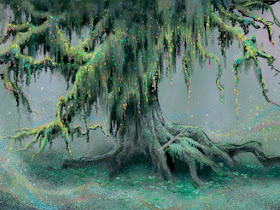 A few years ago, the ad agency that handles the Lucky Charms campaign wanted to revamp the look of the character's world. The directive they gave artists was 'Harry Potter-ish, magical and mysterious'. Calabash, the animation studio that produces the commercials, asked me to come up with some concepts, which are the two paintings below.