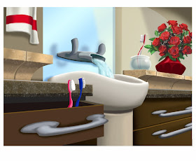 Calabash asked me to take the sketch below and illustrate it, bringing it to a more detailed and clean rendering. Normally I do not like to take on freelance work that has been sketched out for me entirely, however in this illustration I felt there were challenges in the rendering that I wanted to take a crack at, such as stone countertops, a mirror and running tap water. Given that I only had a day to paint this, it was probably a good thing that the sketch was already worked out.